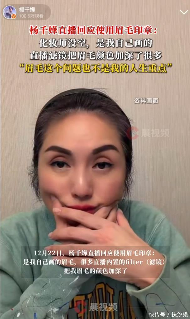 最近,一场直播让歌手杨千嬅意外陷入了“妆容危机”。12月20日,她现身直播间,没想到网友们的焦点齐刷刷从新歌跑偏到了她的脸上——那对浓黑粗重的眉毛被集体调侃为“蜡笔小新同款”,配上深色口红和眼线,被粉丝直呼“画风惊悚”,甚至有人猜测她是不是用了“眉毛印章”这种手残党神器。 眼看讨论愈演愈烈,杨千嬅在12月22日火速开启直播亲自回应。她一句“是我自己画的眉毛”,干脆利落地否认了使用工具,随后将“锅”甩给了直播滤镜:原来是因为化妆师不在,她自己动手,结果直播内置的filter(滤镜)自动把眉色狠狠加深,这才酿成了“蜡笔小新眉”的乌龙。她还幽默承认化妆技术有待提高,已经去请教了专业人士,并透露自己平时其实更爱淡妆,这次只是心血来潮的尝试。
